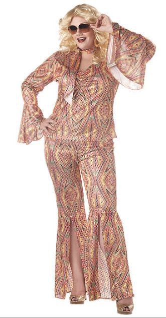 Discolicious ladies costume includes a multi colour sequin top with bell sleeves and a pair of matching trousers with front split flare. Our disco costume also includes a co ordinating neck scarf.