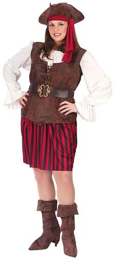 The High Seas Buccaneer Pirate Costume includes blouse with attached vest, skirt, belt, bandana, distressed boot tops, pirate hat.
