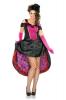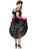 Plus Size Highkick Honey costume consists of a fringe trimmed black and pink dress ruched tulle ruffle skirt, sequin elastic accents, and removable bow back.