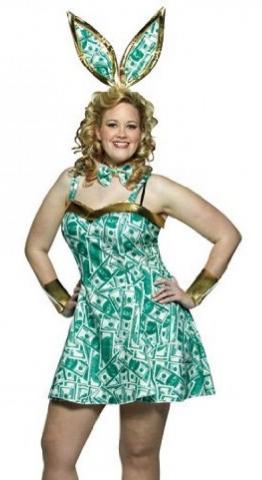 Our Money Hunny costume features a mini dress with a money print and gold trim, bow tie collar, and gold cuffs.