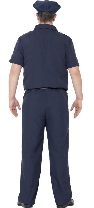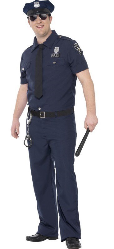 Plus Size NYC Cop Costume includes a navy police shirt with bade detailing and a black mock tie. To complete the look a police hat with badge and black belt is also included.