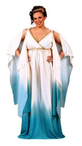 The Greek Goddess costume includes a full length cream and blue gown with gold hoop detail on the shoulders with draped sleeves. Gold trim decorates the neckline, with an elasticated waist. A gold braid ribbon ties the dress at the back.