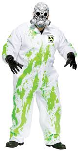 The Radioactive Recovery Team Plus Size costume consists of a one piece white jumpsuit with printed green radioactive strains and black biohazard symbol on the chest.