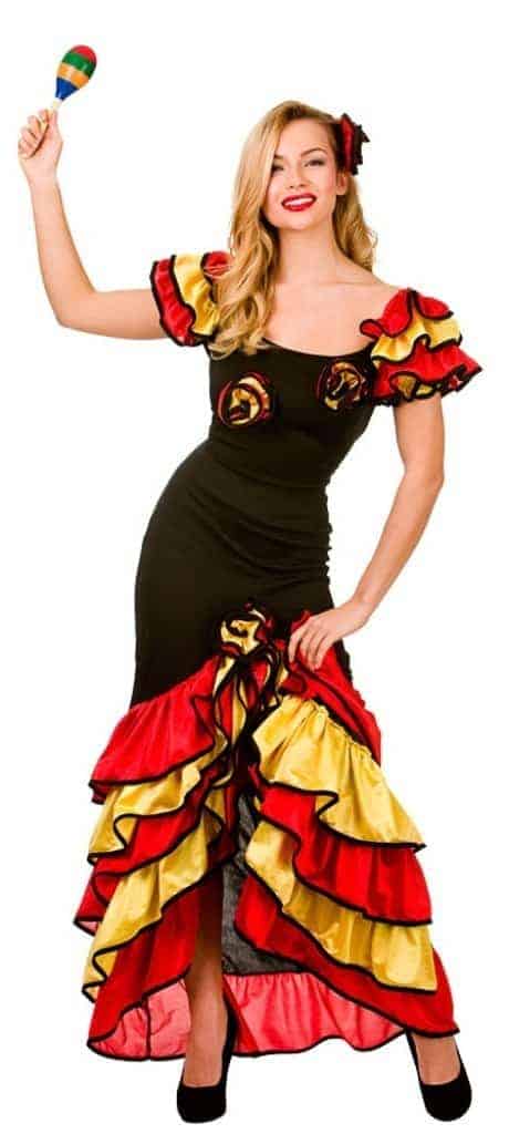Plus Size Rumba Dancer costume includes a black dress with red and yellow ruffles along the sleeves and bottom of dress. To complete the look a flower hair clip is also included.