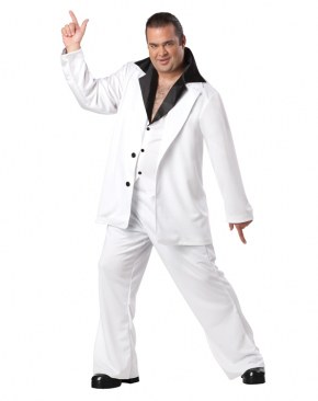 Plus Size Saturday Night Fever Costume consists of a white jacket with black buttons and a white button down vest with attached collar. The costume also comes with matching flared trousers to complete the disco look.