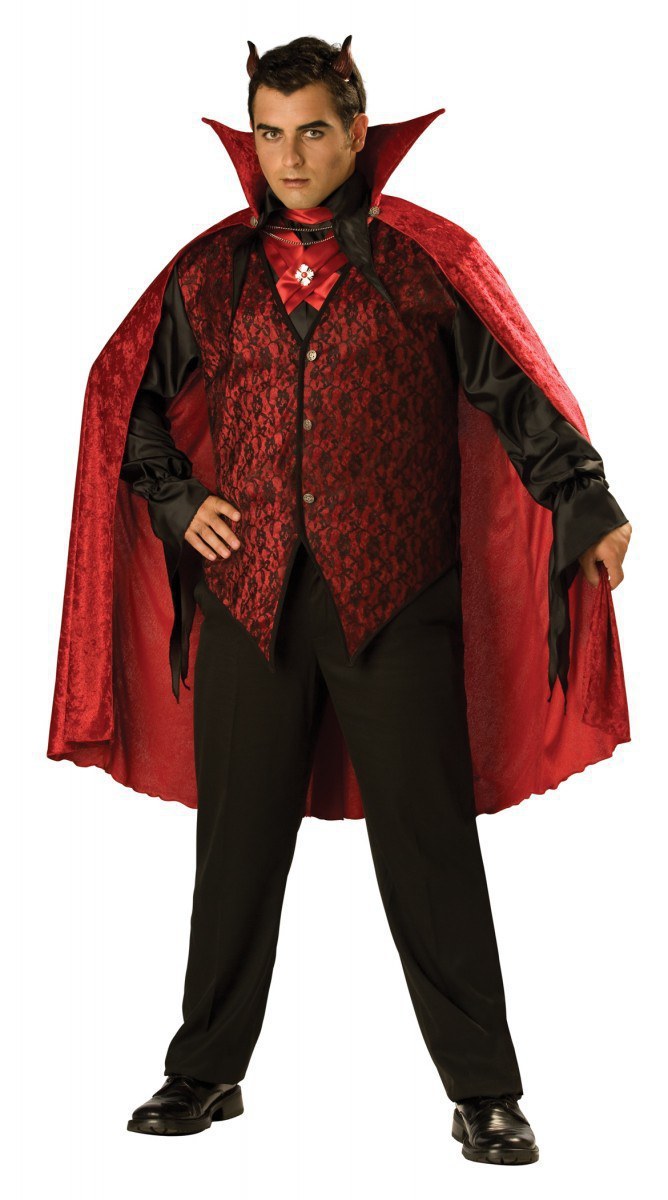 Our Sinister Devil Costume consists of a high quality velour red cape, a red and black lace patterned vest with attached sleeves, a dickie bow with attached tie and medallion.