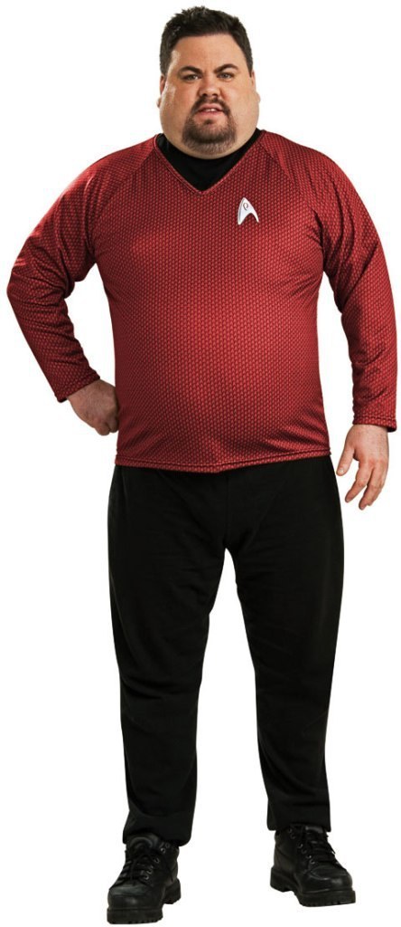 Plus Size Star Trek Scotty red v-neck top with black neckline and Star Trek symbol.
