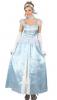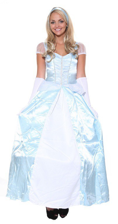 Sweet Cinders costume includes long pale blue short sleeved with white sheer detail shoulders.