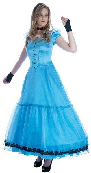 The beautiful Victorian Tea Party Dress is a long blue hooped dress with a fitted waistband.