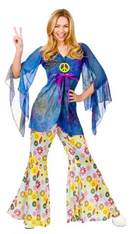 Plus Size Woodstock Hippie costume consists of a long pale blue and lilac chiffon top with lilac ribbon on the waist and flower print flared trousers.