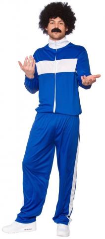 Funny Athlete Costume includes a blue and white zip up jacket with matching trousers. The trousers feature an elasticated waist.