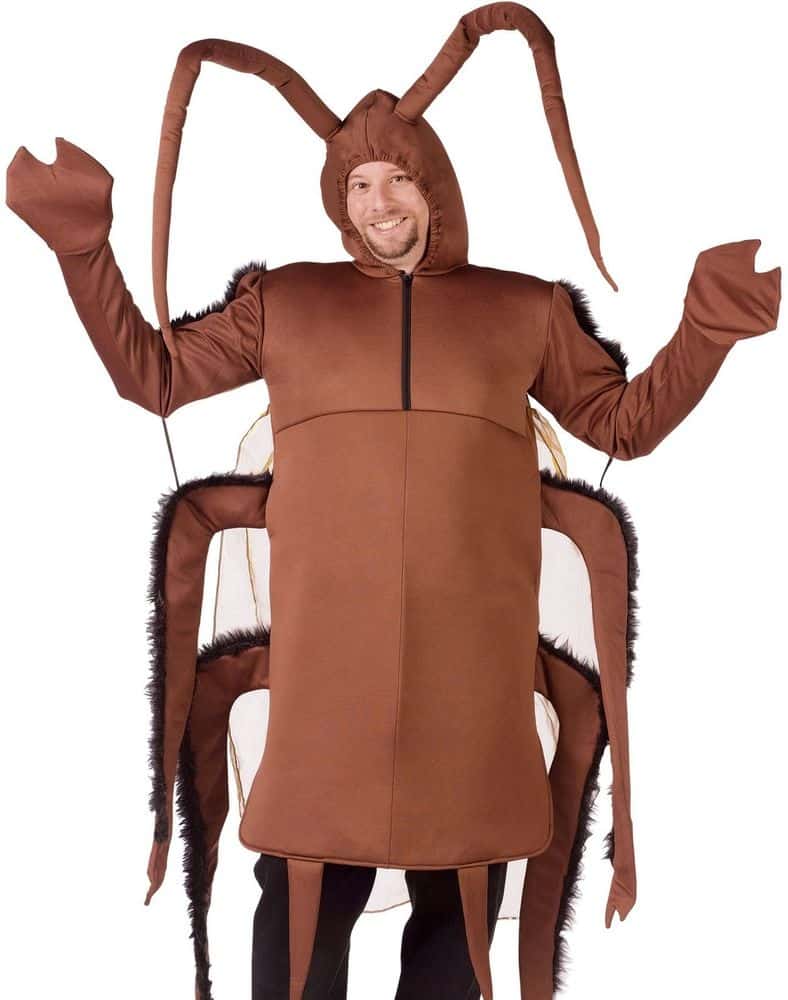 Adult cockroach costume consists of a brown soft foam tunic with zip up front, attached hood with cockroach antennae and long sleeves with attached mittens to cover the hands. The tunic also has four attached cockroach legs complete with hair and light mesh wings attached to the back.