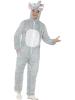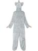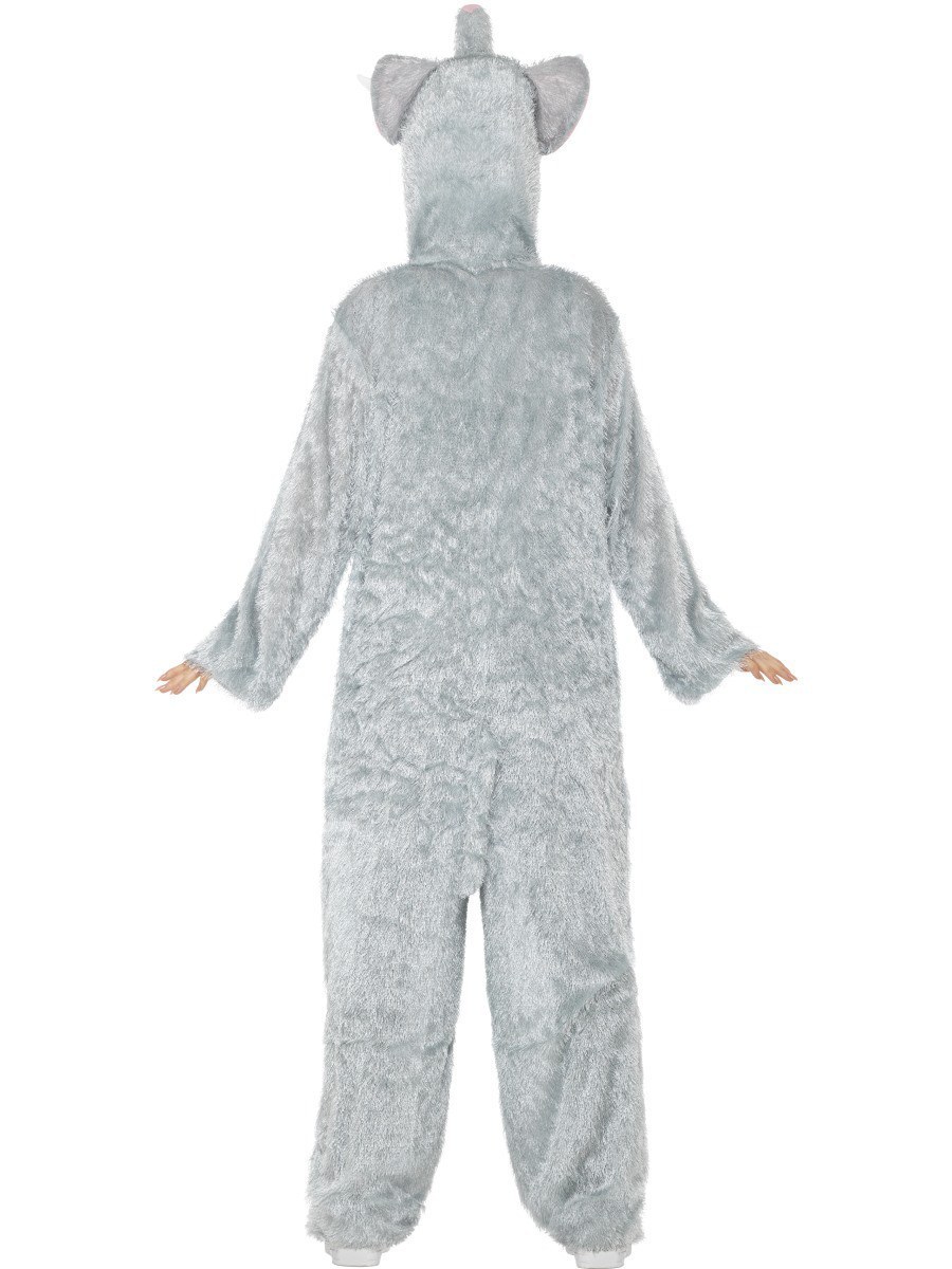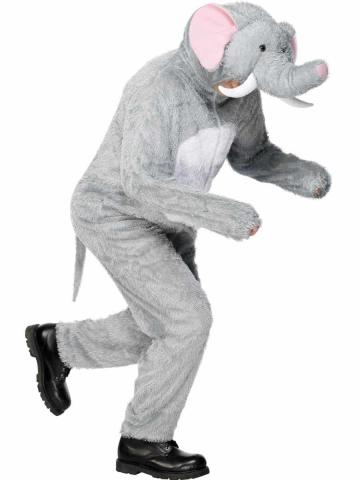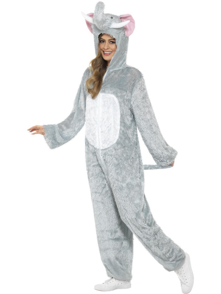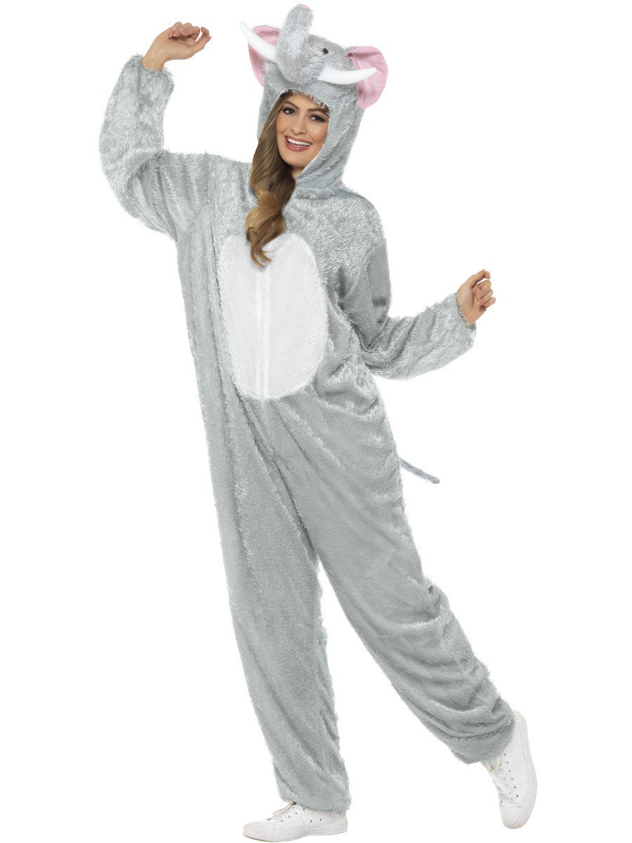 Adult Elephant Costume is a zip up jumpsuit with attached hood with elephants eyes, ears, trunk and tusks. White belly and attached tail complete this costume.