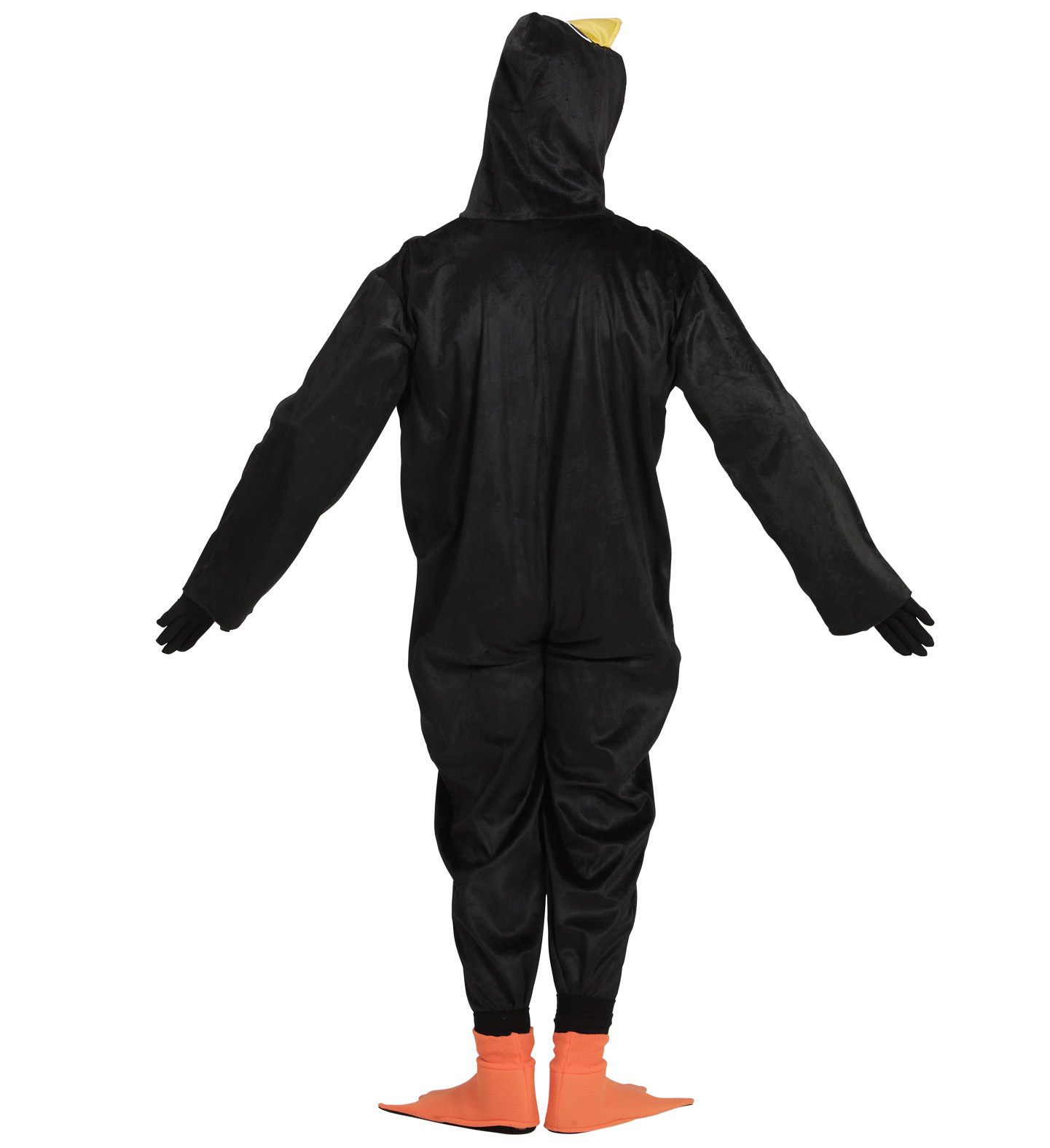 Adult Penguin Costume is a zip up jump suit with attached hood with facial details and penguin feet shoe covers.