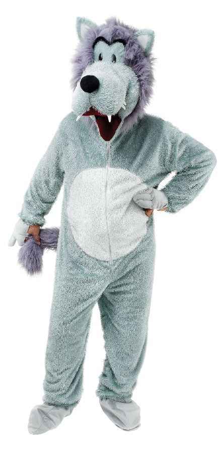 Adult wolf costume includes a one piece textured jumpsuit with attached boot covers and paw covers and frontal zip closure. To complete the pictured look there is also a big head headpiece included with hole at mouth to look out through.