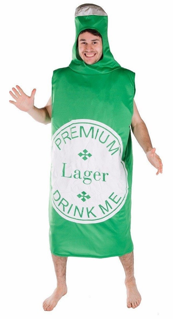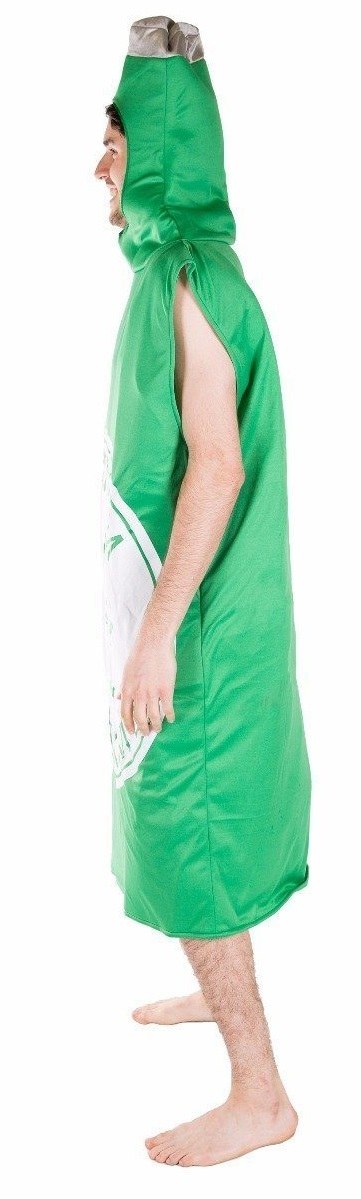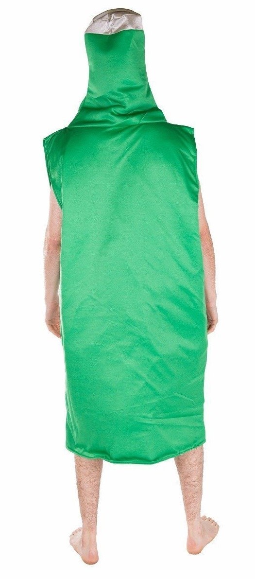 Beer Bottle Costume includes a one piece printed foam suit with openings for your face and at the sides and the bottom for arms and legs.