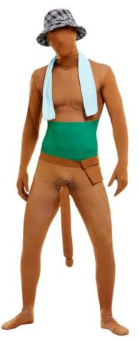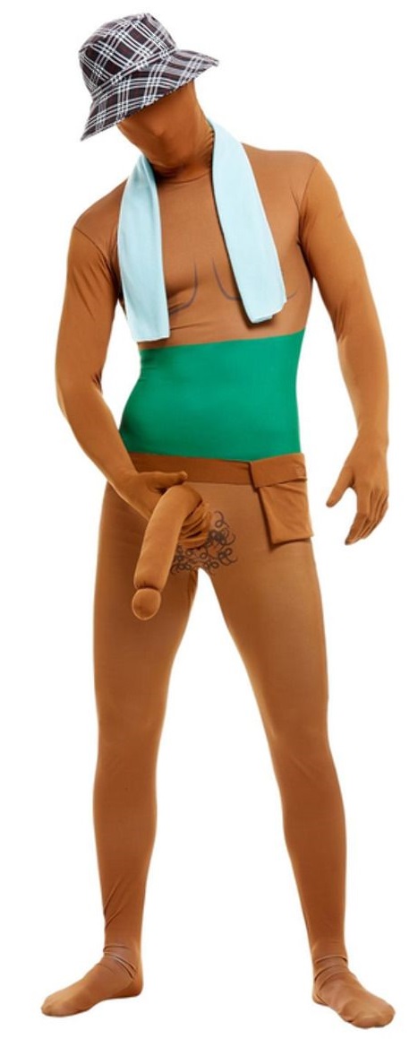 Not for the faint hearted our Big Willy Man Costume is perfect for any stag or fancy dress event. This hilarious costume features a browb lycra all in one bodysuit with printed pecks, a green stomach and an attached willy. To complete the look is a checked bucket hat, a blue scarf and a fabric bum bag are also included.