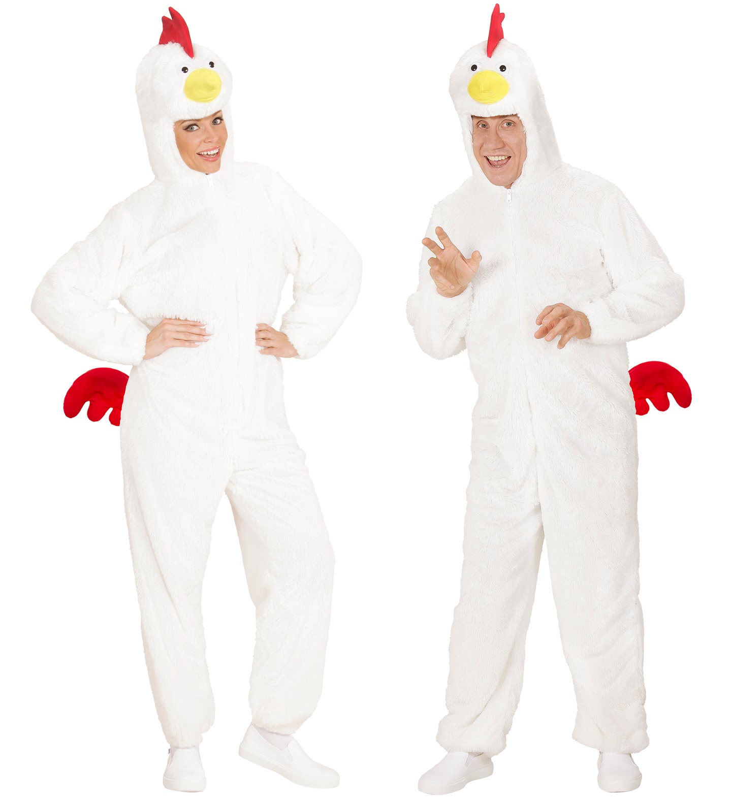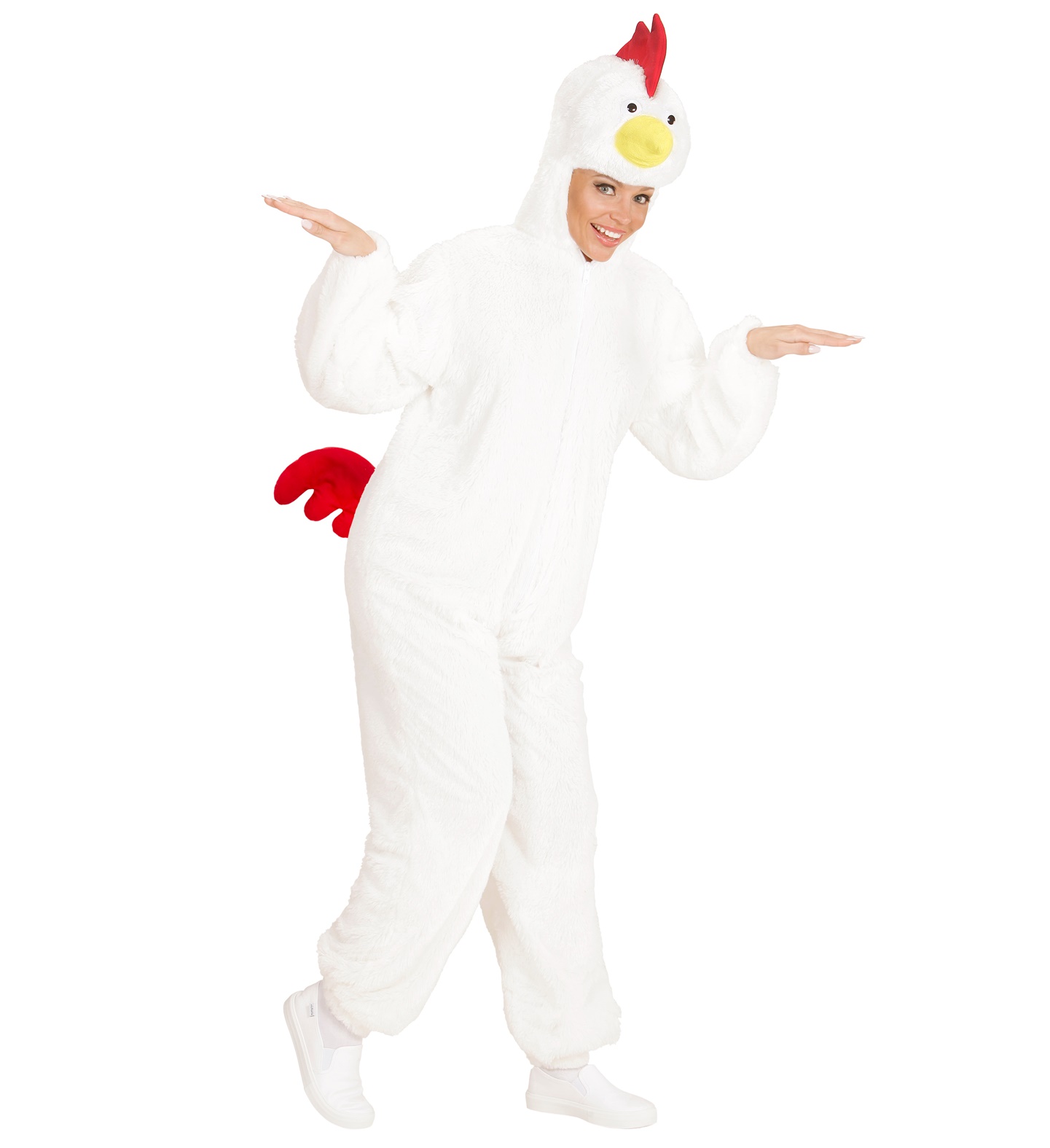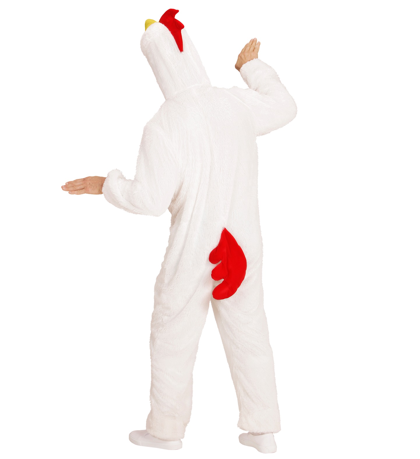 Included is hooded chicken jumpsuit with an attached mask.