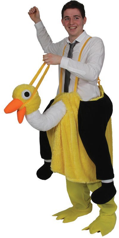 Men's funny Crazy Ostrich costume includes a yellow fur body to go round the waist with attached false legs and Ostrich head, yellow Ostrich trousers with attached Ostrich feet.