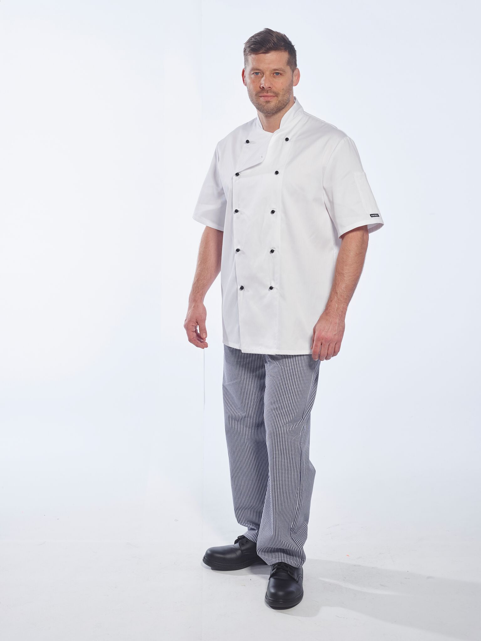 Turn into Master Chef with this premium quality Deluxe Chefs Jacket. This short sleeve jacket will keep you feeling and looking cool. The classic styling offers a range of high quality features including easy care fabric and a handy sleeve pocket