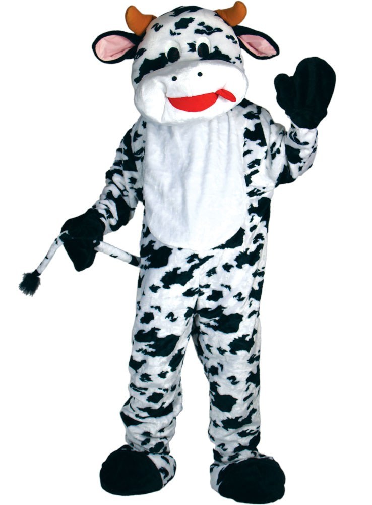 This Deluxe Cow Mascot Costume is a fantastic costume for any big event. It consists of a full body black and white print, fur jumpsuit with attached tail, a cows head complete with big ears, horns, mouth and eyes with see through mesh and black fur shoe covers. The attached mittens have a hidden opening for the hands when needed.