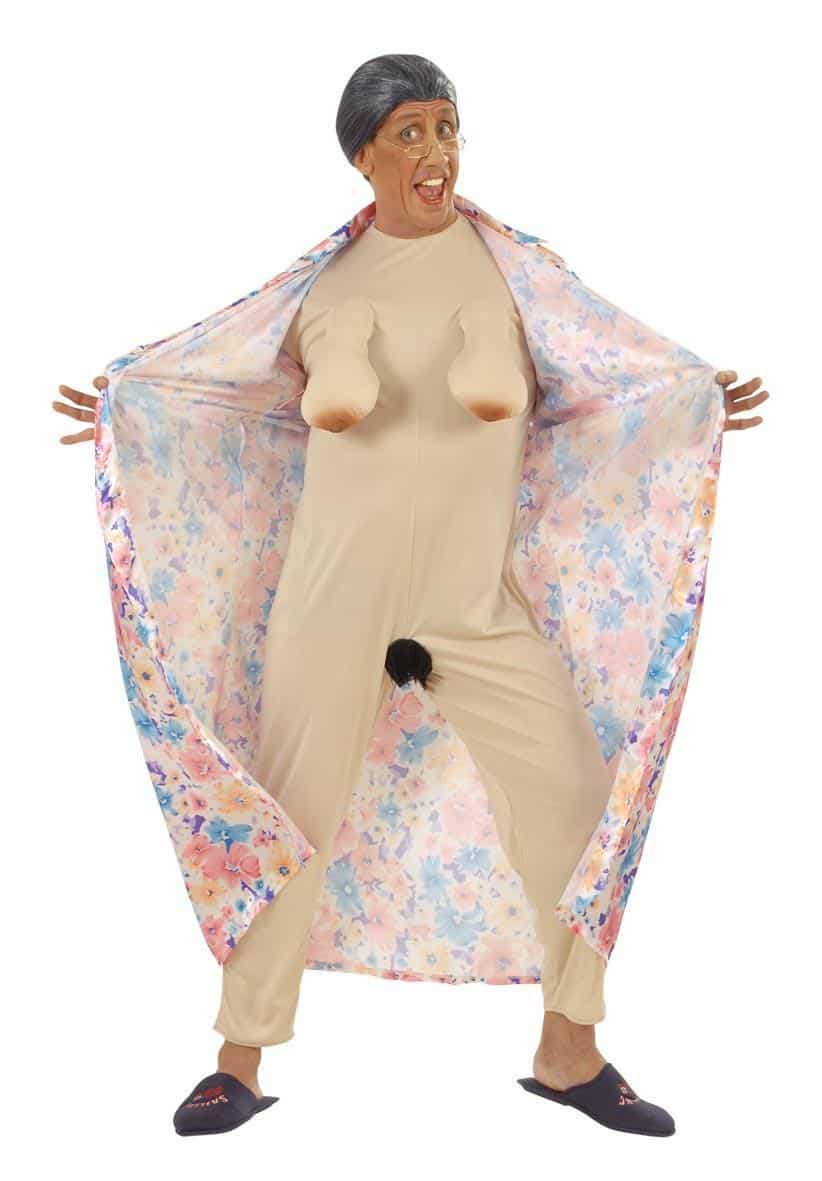 The Flashing Granny costume includes a body suit and velcro closed satin floral dress for easy exposure.