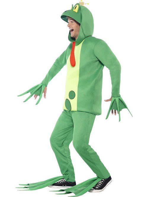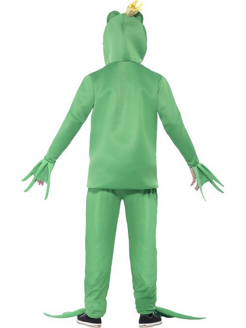 Frog Prince costume includes a one piece green bodysuit with attached gloves and a pair of green trousers. Also included is a frog headpiece.
