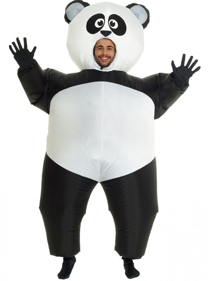 Giant Panda Inflatable Costume includes a one piece inflatable suit with a battery operated fan. (Requires 4AA, Batteries not included)