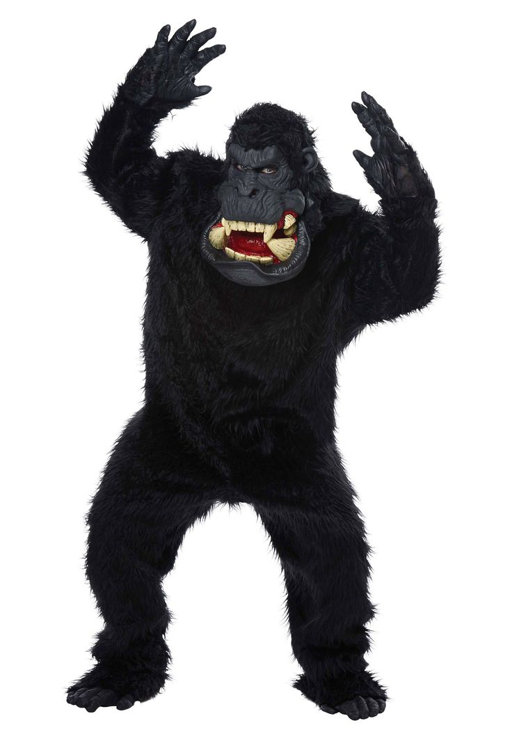 Our Goin' Bananas gorilla costume set includes a Big Mouth Mask equipped with a movable mouth. Accompanied by a furry jumpsuit, gorilla gloves, and shoe covers, this set is designed for immersive fun.