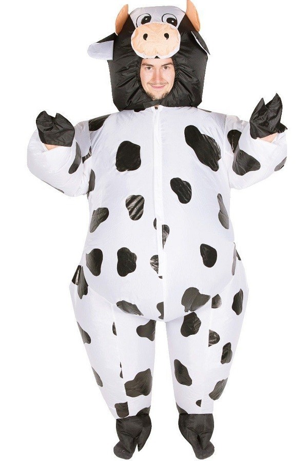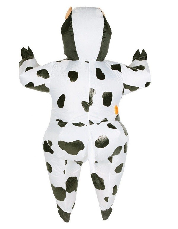 Adult Inflatable Cow costume includes a one piece inflatable cow suit with a fan. Requires 4 x AA Batteries (not included)