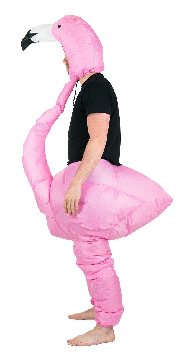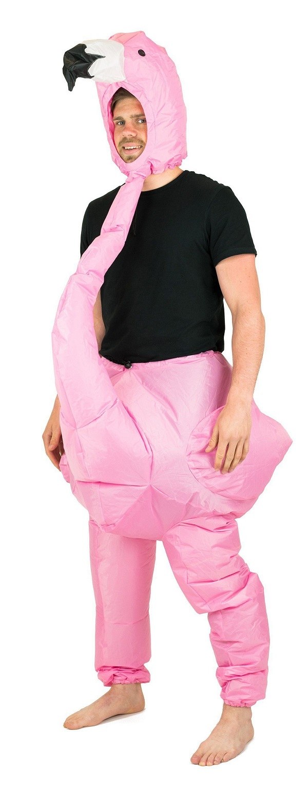 Adult Inflatable Flamingo costume includes a one piece inflatable Flamingo suit with a drawstring waist and a fan to inflate the costume. Requires 4 x AA Batteries (not included)