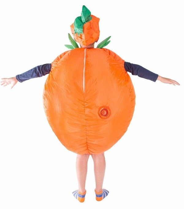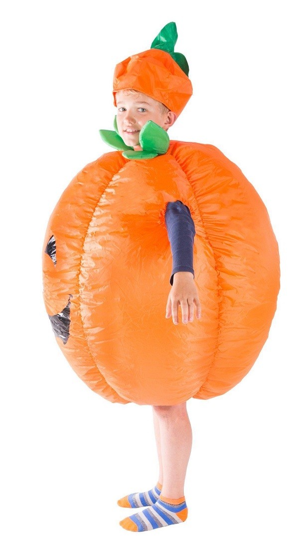 Kids Inflatable Pumpkin costume includes a one piece inflatable Pumpkin suit with fan to inflate the costume Requires 4 x AA Batteries (not included).