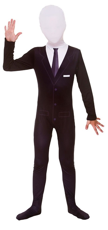 Kids Slenderman Skinz are a one piece stretch bodysuit with double zip and suit print.