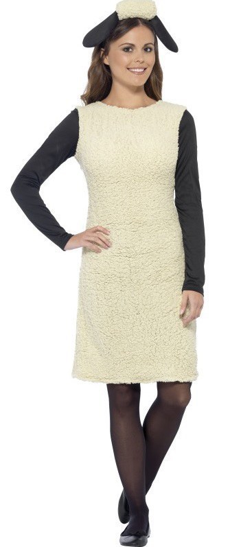 Ladies Shaun The Sheep Costume includes a cream faux wool dress with black sleeves and also features an attached tail. To complete the look a headpiece is also included.