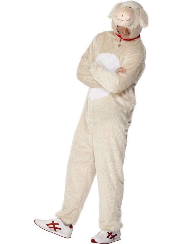 Lamb Costume consists of a textured beige jumpsuit with white stomach and attached hood with eyes, ears and nose.