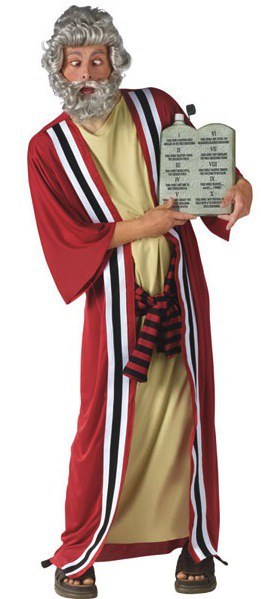 Moses and 10 Commandments Costume features a full length beige robe with attached red caftan. The costume also comes with an attached red and black striped sash.