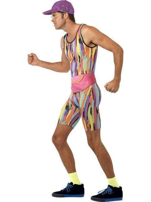 Mr. Energizer men's fancy dress costume features a colourful and very fitting jumpsuit with no sleeves and short legs.