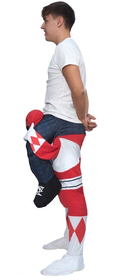 Piggyback Red Power Ranger costume includes a one piece printed suit with attached fake legs and hands.