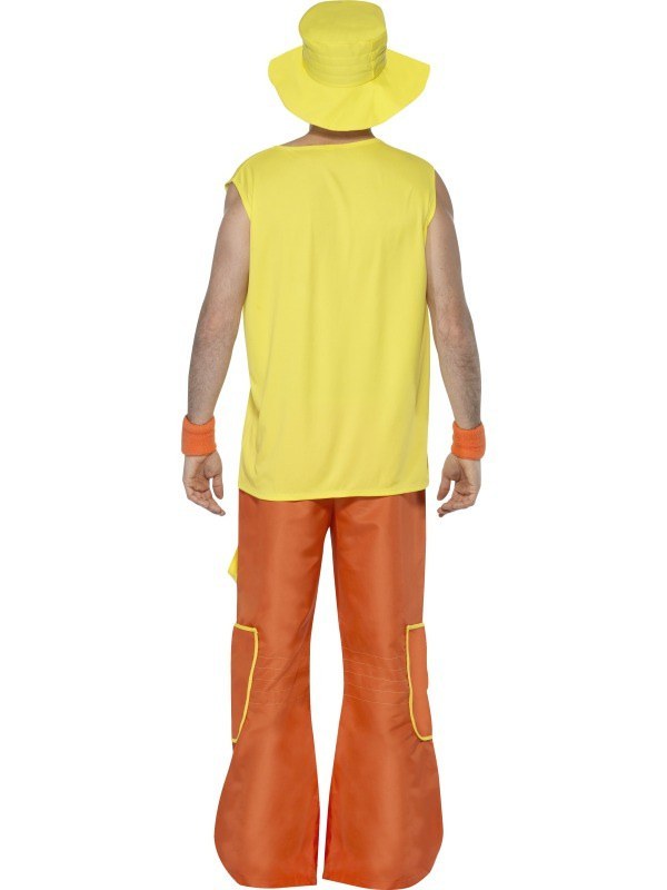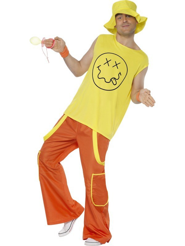 Be part of the 90's raving craze with our Raver costume. Included is this costume is a yellw short sleeved t shirt with smiley face print and a pair of ornage trousers with an elasticated waist and yellow detailing. To complete this 90's look a yellow hat is also included.