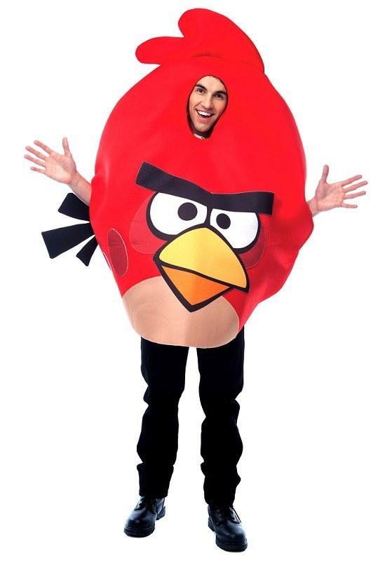 Red Angry Birds Adult Costume features a red foam pullover with printed red angry bird face, attached tail and openings for the hands and face.