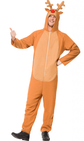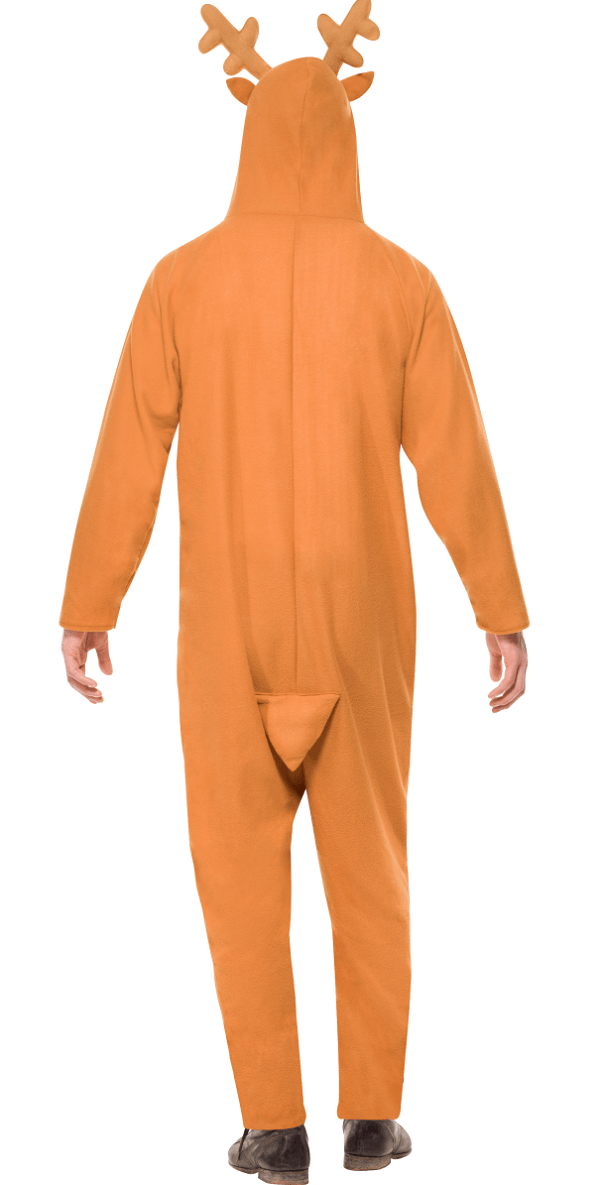 Reindeer Costume includes a brown one piece jumpsuit with a reindeer hood.