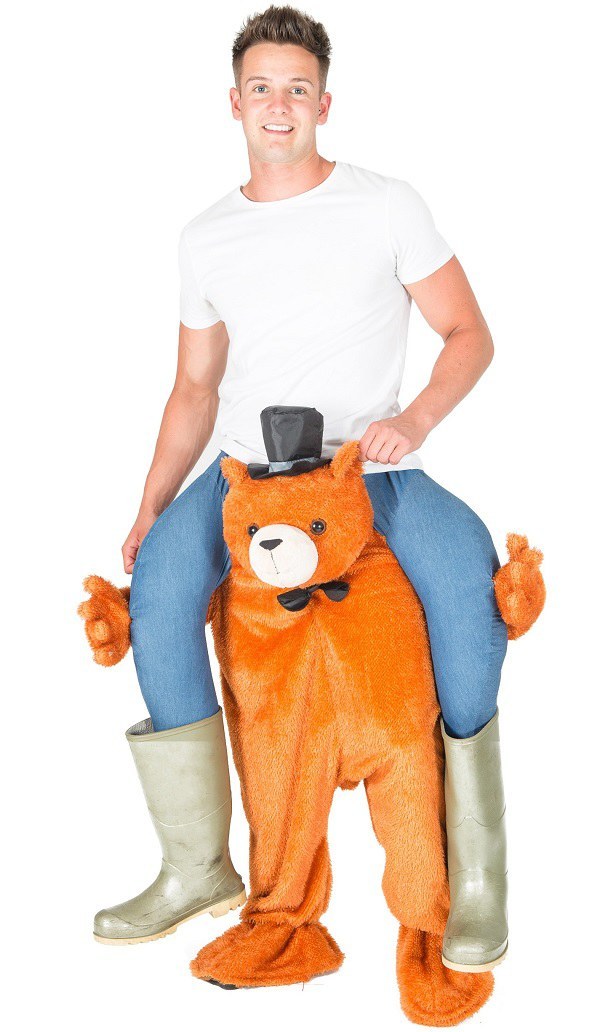Ride On Bear Costume includes a one piece costume with an elasticated waist with a corded belt for adjustment. This hilarious costume also includes attached false human legs.