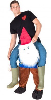 Ride On Gnome Costume includes a one piece costume with an elasticated waist with a corded belt for adjustment. This hilarious costume also includes attached false human legs.