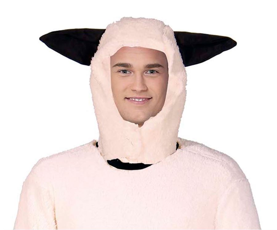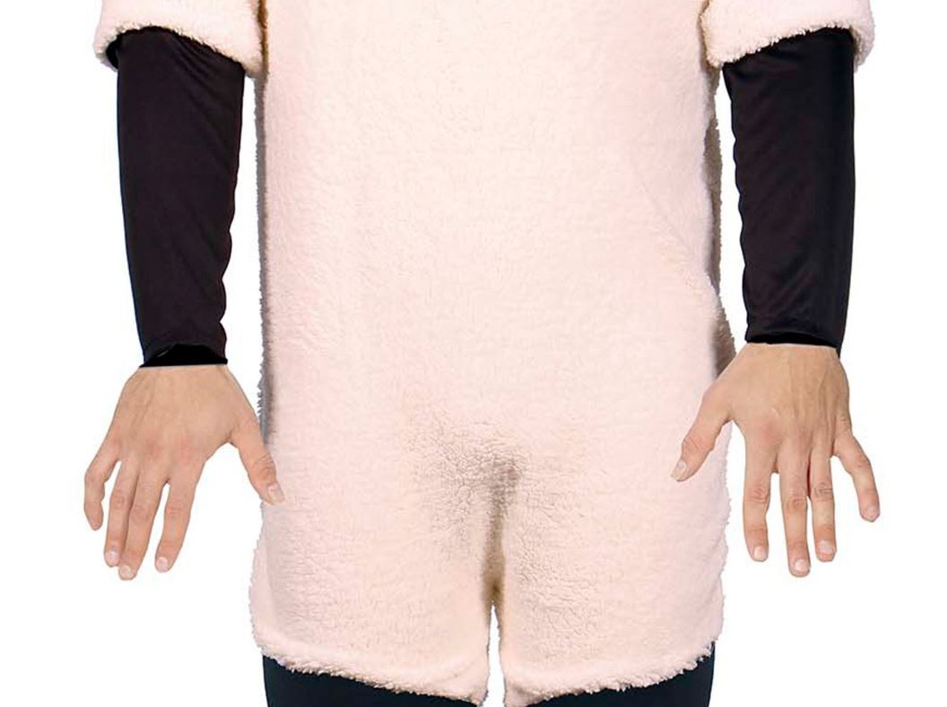 The Adult Sheep Costume features a cozy white jumpsuit with a cute white stomach detail and an attached hood complete with adorable sheep ears, perfect for fun parties or Halloween dress-up.