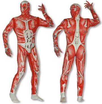 Adult costume includes muscle tone jumpsuit with intricate detail on both the front and back, matching mask and co-ordinating gloves.