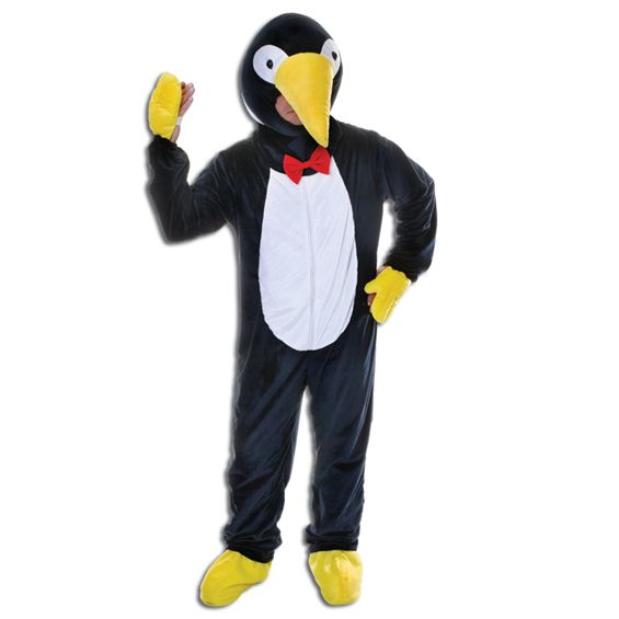 Penguin costume includes a one piece texture jumpsuit in black with white chest and red dickie bow. Jumpsuit has attached yellow gloves and shoe covers. To complete this costume a penguin headpiece is also included.