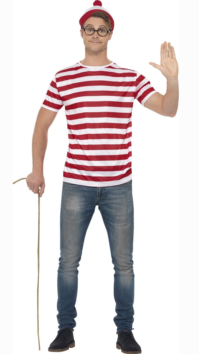 Where's Wally Kit includes a red and white striped top, matching hat and a pair of black glasses frames.