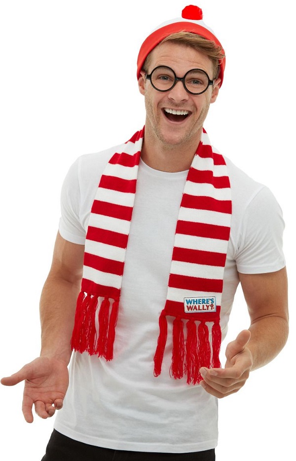Where's Wally Kit includes a red and white knitted scarf, matching hat and a pair of round glasses.