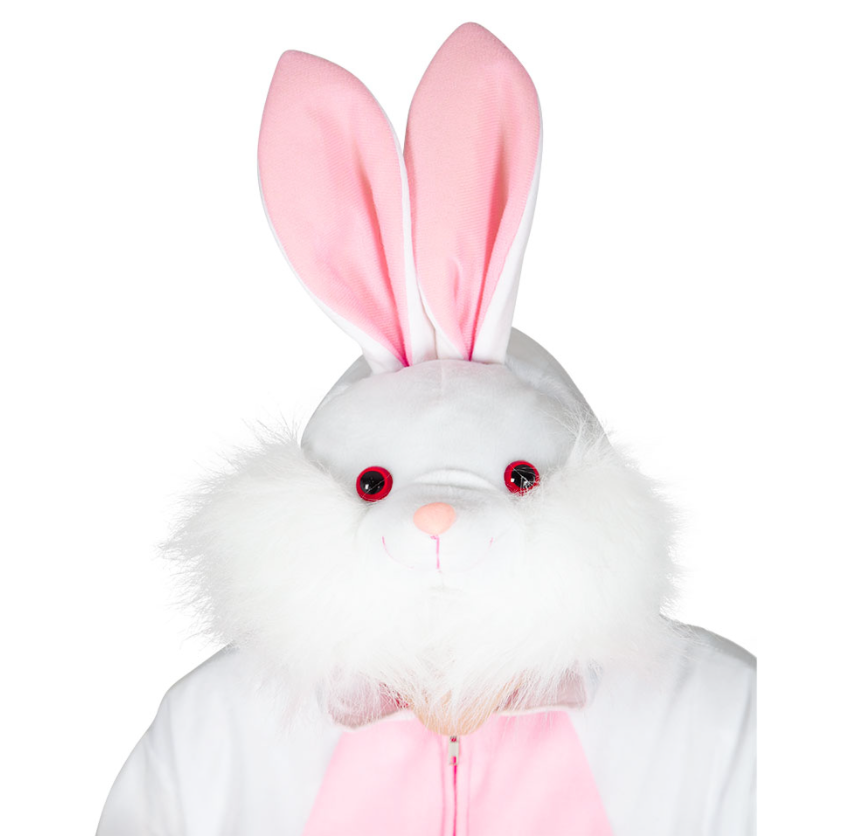 A white and pink bunny jumpsuit is included with a bunny head hood attached.