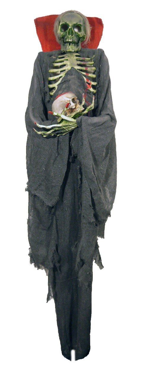 Creepy Halloween Vampire Hanging decoration. Designed with a long black draped cloth and a skeleton hands and skull. Also one hand is holding a small skull with gauze on the top of the skull.
